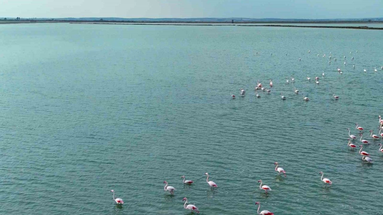 Adana’nın Karataş ilçesinde bulunan Akyatan Lagünü`nde konaklayan flamingolar görsel şölen sunuyor.