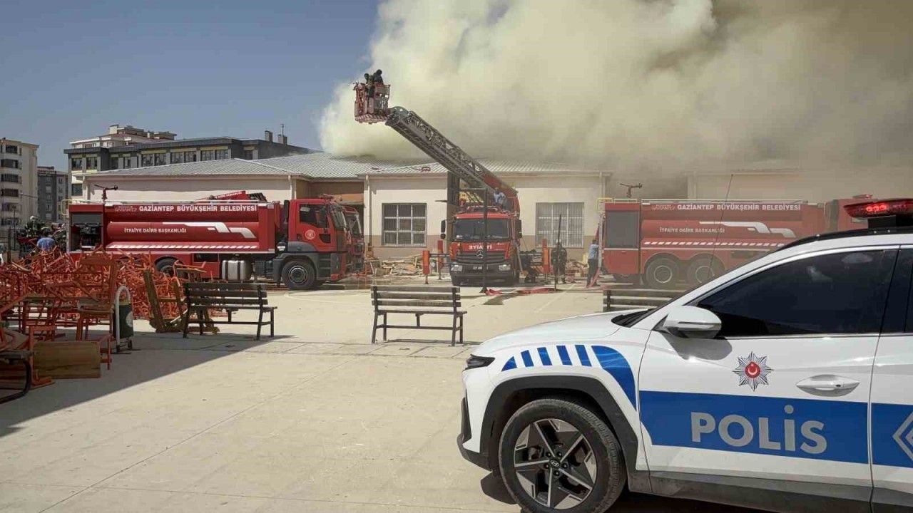 Gaziantep’te bir meslek lisesinin mobilya atölyesinde yangın çıktı. Yangına çok sayıda itfaiye ekibi müdahale ediyor.