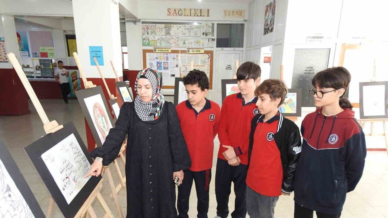 Gaziantep’te ortaokul öğrencileri, İsrail’in Gazze’deki katliamlarına dikkat çekmek amacıyla resim sergisi düzenledi.