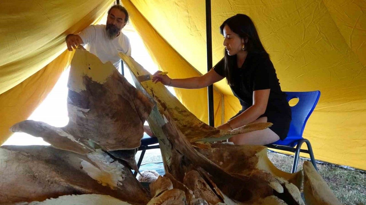 Mersin Körfezi’nde 4 yıl önce bir deniz aracının çarpması sonucu ölen Mersin Üniversitesi (MEÜ) Yenişehir Kampüsü Deniz Canlıları Müzesi bahçesine gömülen yaklaşık 16 metrelik Fin balinasının kemiklerinin çıkarılması yaklaşık bir haftada tamamlandı. ‘Balinanın Sessizliği Bilime Dönüşüyor’ projesi kapsamında yürütülen keşif kazısı çalışmalarında, şimdi dev iskeletin en kritik aşaması olan yapıştırma ve birleştirme sürecine geçildi. Kazı sırasında kırıklarla birlikte yaklaşık bine yakın kemik parçasına ulaşıldı. Bu parçalar müzenin önünde kurulan büyük çadırın altında tek tek temizlenerek, numaralandırılıyor ve doğru anatomik noktalarına yerleştirilerek yapıştırılıyor.