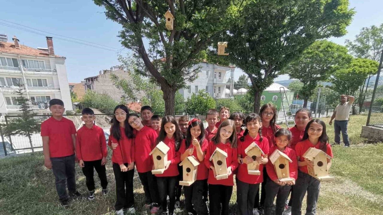 Kütahya’nın Hisarcık ilçesi Cumhuriyet İlkokulu öğrencileri, ahşap kuş yuvalarını okul bahçesindeki ağaçlara astılar.