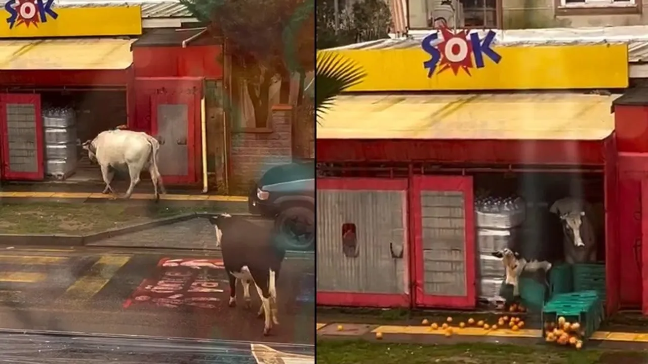Çok sayıda beğeni ve yorum alan görüntülerde, markete giren iki ineğin marulları yediği, bu sırada temizlik yapan bir personelin elindeki paspasla hayvanları uzaklaştırdığı ve girişteki meyve sebze kasalarının devrilme görüntüleri şaşkınlık içinde izlendi.