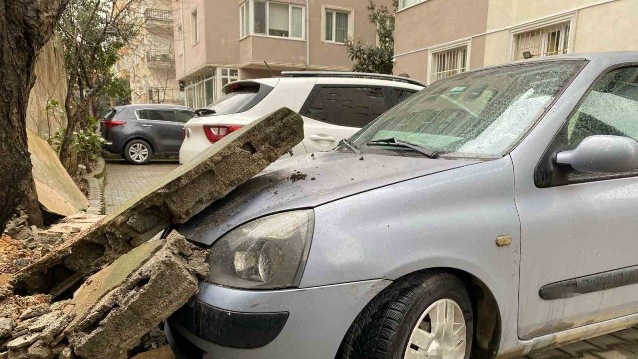 Kadıköy’de bir sitenin otoparkında park halinde bulunan otomobilin üzerine istinat duvarı düştü.