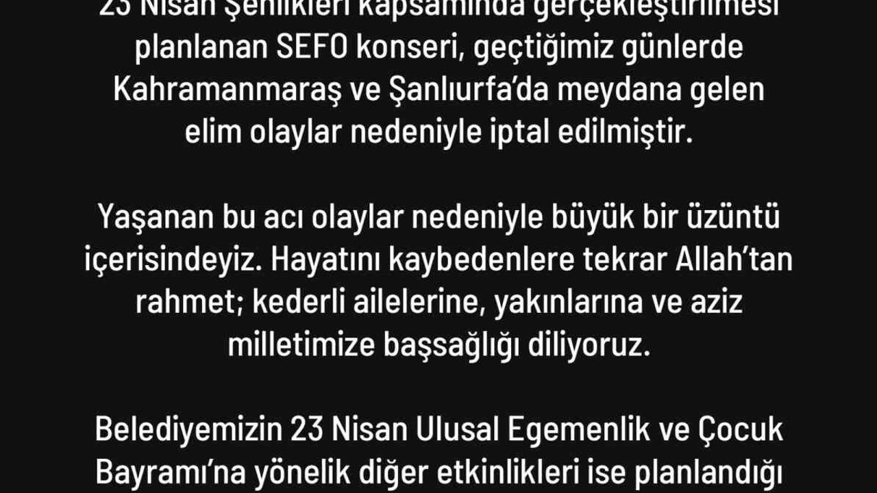 Denizli Büyükşehir Belediyesi, 23 Nisan Ulusal Egemenlik ve Çocuk Bayramı etkinlikleri kapsamında gerçekleştirilmesi planlanan Sefo konserinin iptal edildiğini duyurdu.