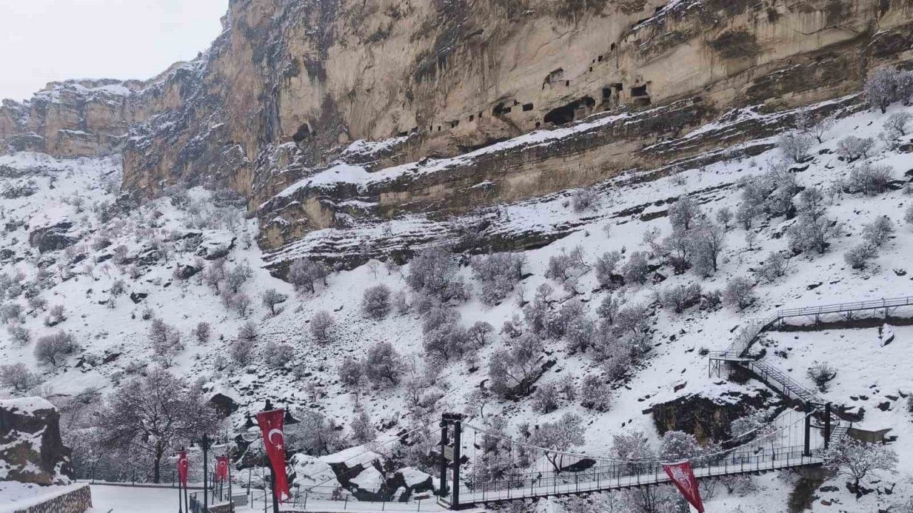 Tunceli’de Urartu dönemine ait tarihi in delikleri, kar ile birlikte kartpostallık görüntüler oluşturdu.