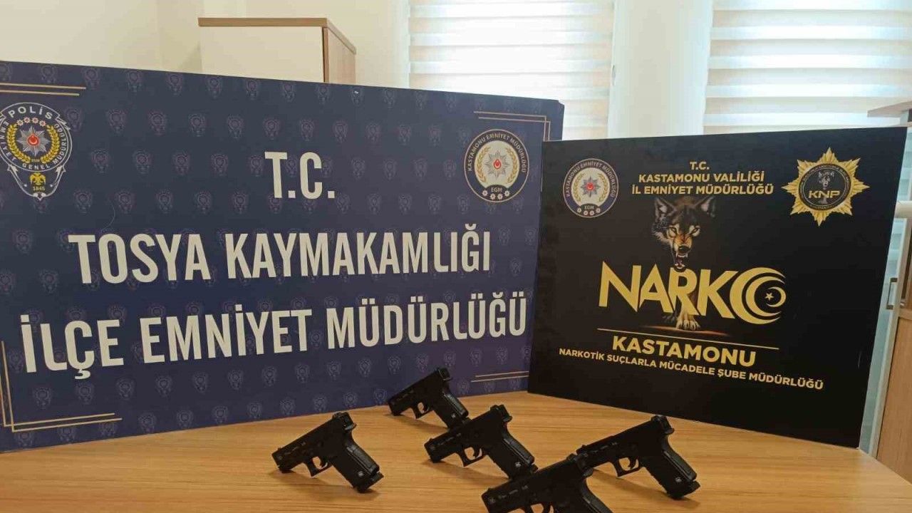 Kastamonu İl Emniyet Müdürlüğüne bağlı Tosya İlçe Emniyet Müdürlüğü ve Narkotik Suçlarla Mücadele Şube Müdürlüğü ekipleri, D-100 karayolu Tosya mevkiinde yaptıkları koordineli çalışmalar sonucu durdurulan araçta arama yapıldı. Arama sonucu 5 adet ruhsatsız tabanca ve tabancalara ait 5 adet şarjör ele geçirildi.