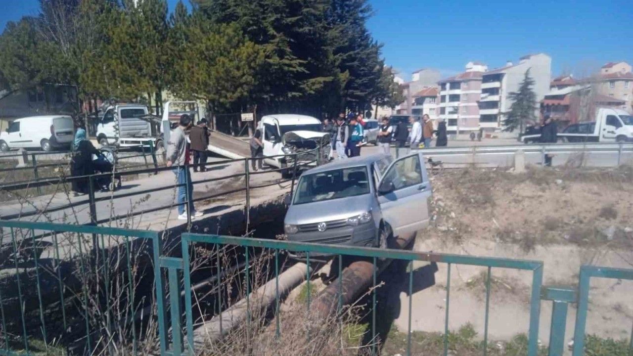 Eskişehir’de iki aracın kafa kafaya çarpışması sonucu meydana gelen trafik kazasında ölen ve yaralanan olmazken, araçlardan biri su kanalı üzerinden gelen boruların üstünde asılı kaldı.