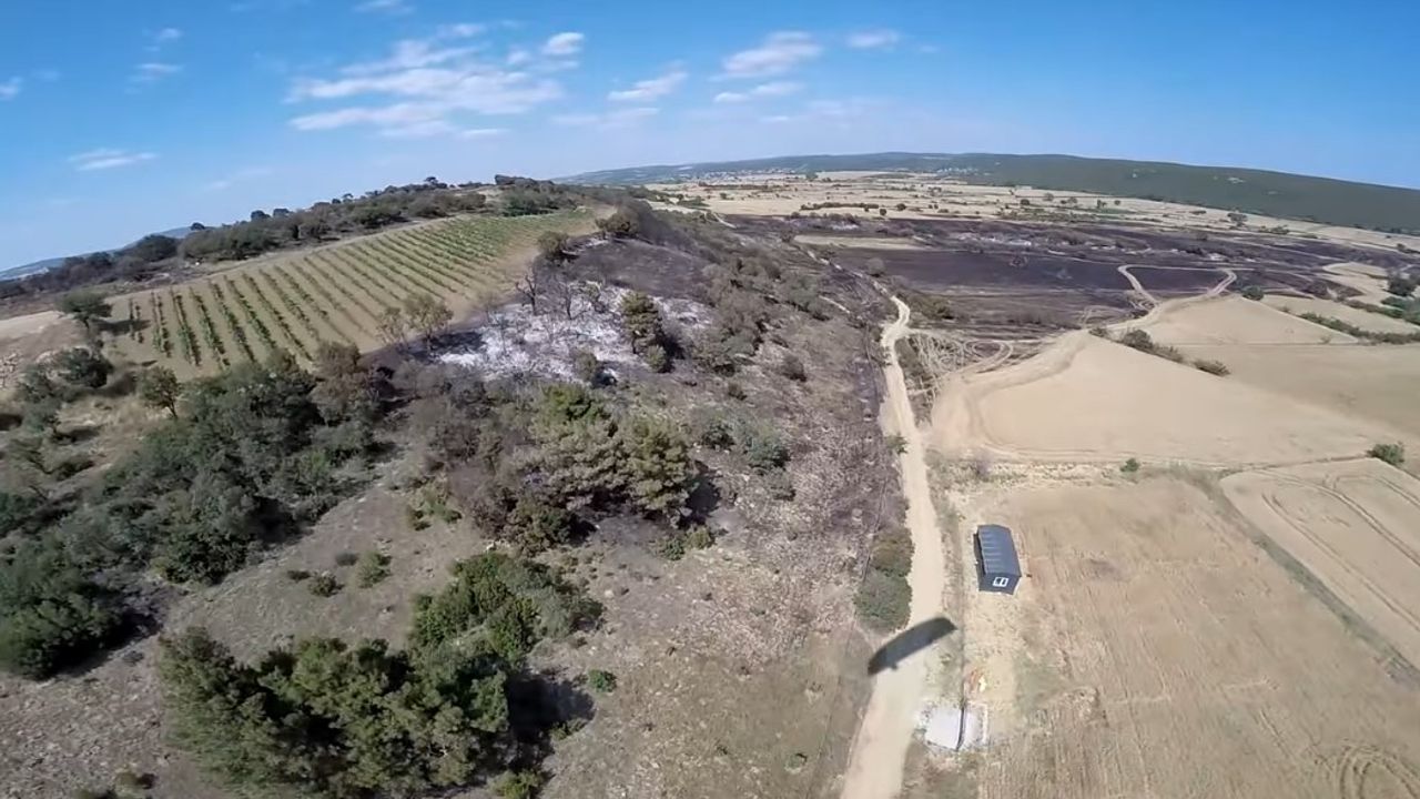 Edirne’nin Keşan ilçesine bağlı Mecidiye köyünde çıkan yangında zarar gören 250 dönüm buğday ekili ve 100 dönümlük alan, paramotor pilotu tarafından havadan görüntülendi.