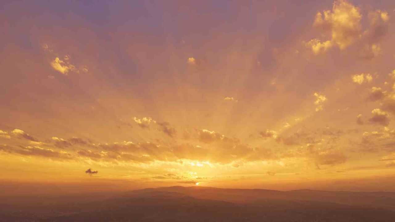 Kırıkkale'de gün batımında güneşin turuncu ışınları bulutların arasından dağlara doğru yayılırken gökyüzünde geniş bir ışık kuşağı oluştu.