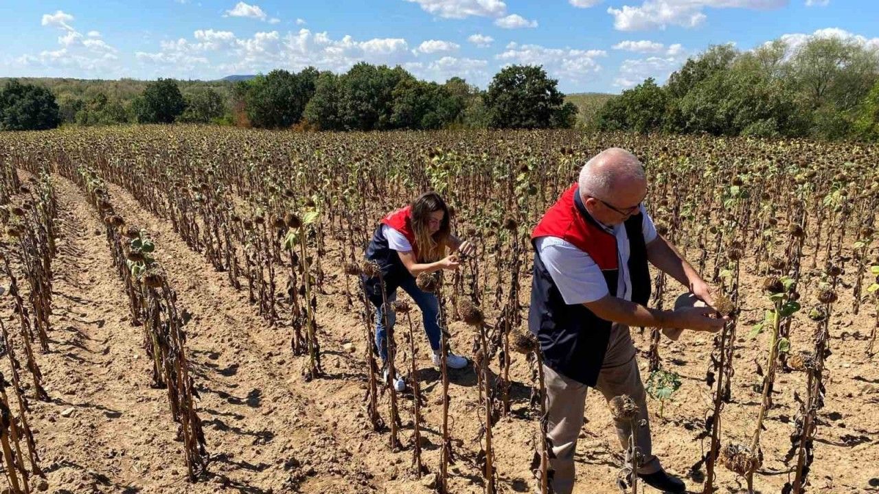 Kırklareli Tarım ve Orman İl Müdürlüğü teknik personeli, kuraklık sebebiyle üretimde yaşanan olumsuzlukların tespiti amacıyla merkez köylerdeki ayçiçeği tarlalarında çalışmalarına devam ediyor.