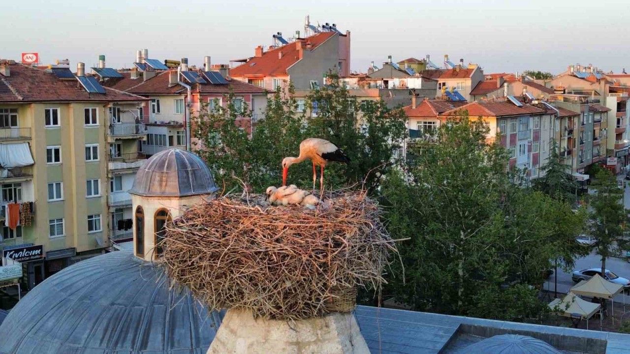 İmaret Mahallesi’ndeki tarihi İmaret Camisi’nin bitişiğindeki Karamanoğlu İbrahim Bey Kümbetindeki yuvalarında kalan leylekler 3 yavru dünyaya getirdi. Göç rotası üzerinde yaklaşık üç ay önce Karaman’a ulaşan leylekler, kümbet üzerindeki yuvalarına yerleşti. Burada konaklayan leyleklerin 3 yavrusu dünyaya geldi. Her yıl aynı dönemde yuvalarına gelen leylekler, cami cemaati ve vatandaşlarca ilgiyle takip ediliyor. Yuvadaki yavrularını besleyen leylek ise dronla havadan görüntülendi. Mahalleli leylek çiftinin her yıl mart ayının sonunda buraya geldiğini ve yavrularını büyüttükten sonra kış aylarına doğru göç ettiğini söyledi.