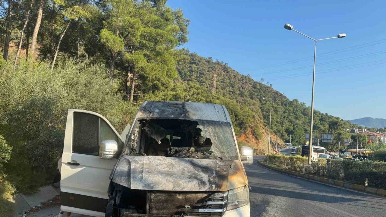 Edinilen bilgilere göre Marmaris’te tatil yapan turistleri havalimanına bırakmak için yola çıkan minibüsün ön kısmından dumanlar çıkmaya başlayınca, şoför aracı sağa çekerek araç içindeki yolcuları ve valizlerini güvenli bir şekilde dışarı çıkardı.