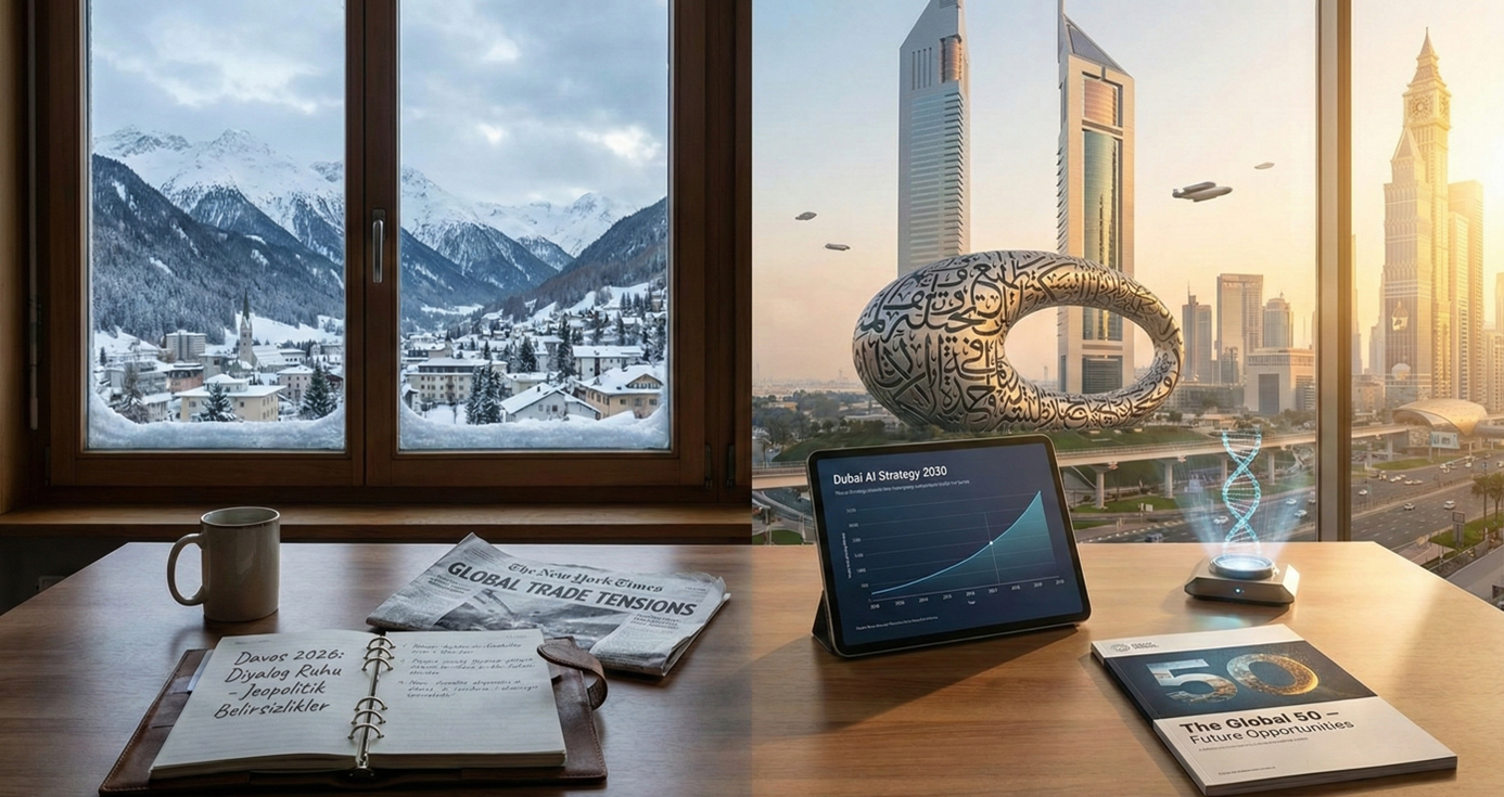 İnsanlık, yeni dünya düzeninin iki farklı yüzüyle art arda yüzleştiği tarihi bir dönemden geçiyor. Bir yanda 2025 yılı boyunca ve özellikle 18-19 Kasım tarihlerinde Orta Doğu'nun teknoloji üssü Dubai’de 100 farklı küresel organizasyondan 2.500 fütüristi bir araya getiren "Dubai Future Forum"un eylem odaklı vizyonu duruyor. Diğer yanda ise hemen ardından, 19-23 Ocak 2026 tarihlerinde İsviçre Alplerinde, "Diyalog Ruhu" temasıyla toplanan 56. Dünya Ekonomik Forumu’nda (Davos) yankılanan jeopolitik endişeler ve büyük güçlerin çekişmeleri yer alıyor.