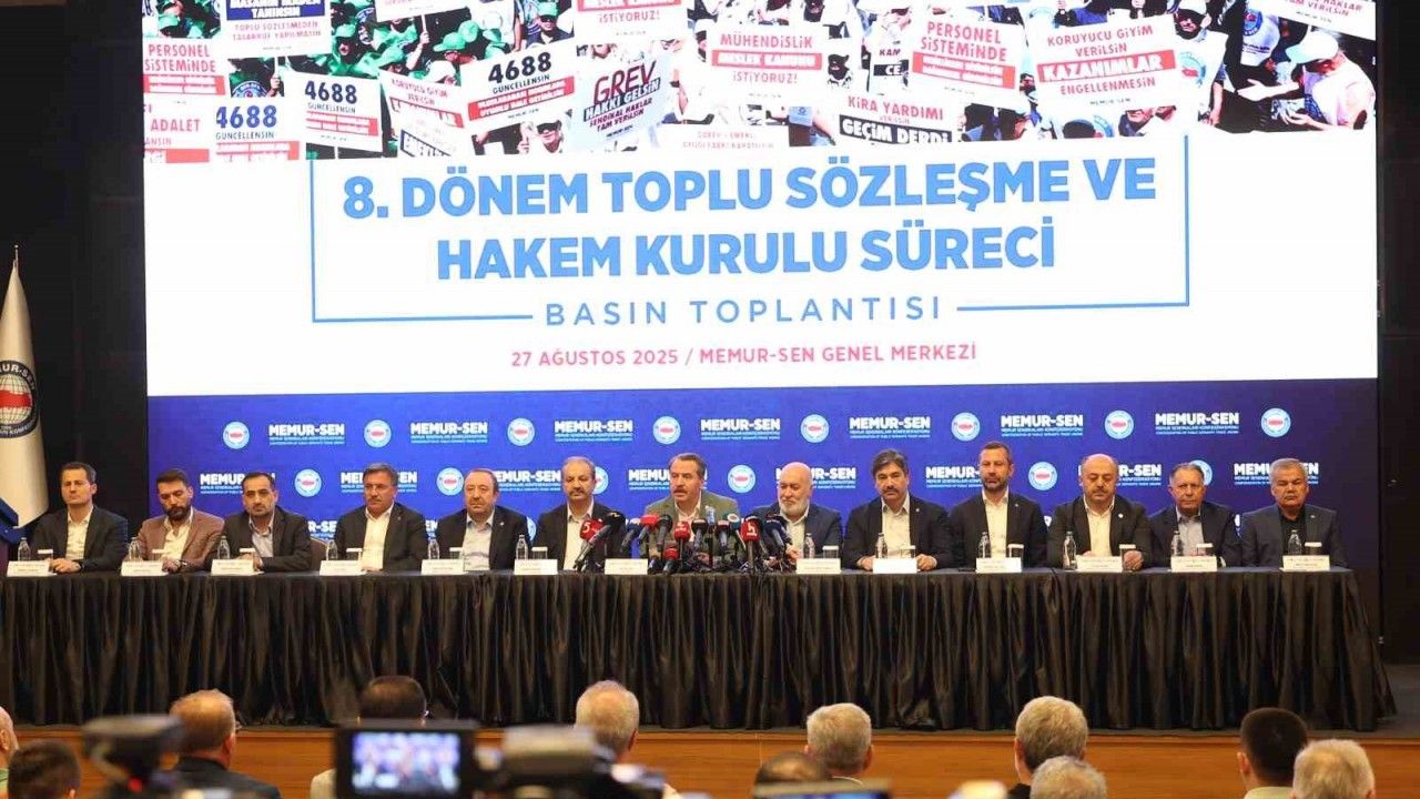 Yaklaşık 4 milyon memur ve 2 buçuk milyon memur emeklisini ilgilendiren 8’inci dönem toplu sözleşme süreci sona erdi. Memur-Sen Genel Başkanı Ali Yalçın, süreci değerlendirmek üzere basın toplantısı düzenledi. Burada konuşan Yalçın, "Çabalarımız, 10 hizmet kolunda bağıtlanan 288 maddeyle karşılık bulurken, genele ilişkin bölümde 68 madde olarak toplamda 356 madde şeklinde sonuca gitmiş oldu. Ancak oransal zam, taban aylık artış, refah payı, ilave 1 derece, ailenin güçlendirilmesi, gelir vergisinin yüzde 15’e sabitlenmesi kamuda ücret dengesi ve gelirde adaletin sağlanması konusundaki gayretlerimiz maalesef karşılık bulmadı ve uzlaşma sağlayamadık" ifadelerini kullandı.