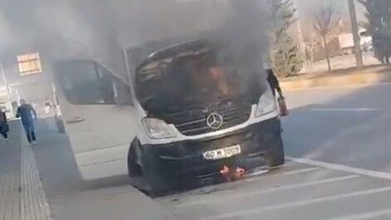 Tokat’ta seyir halindeki bir işçi servisi motor kısmından yanmaya başladı, Mercedes marka minibüs yanarak kullanılmaz hale gelirken işçiler güçlükle kurtuldu.