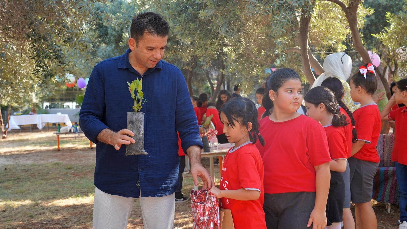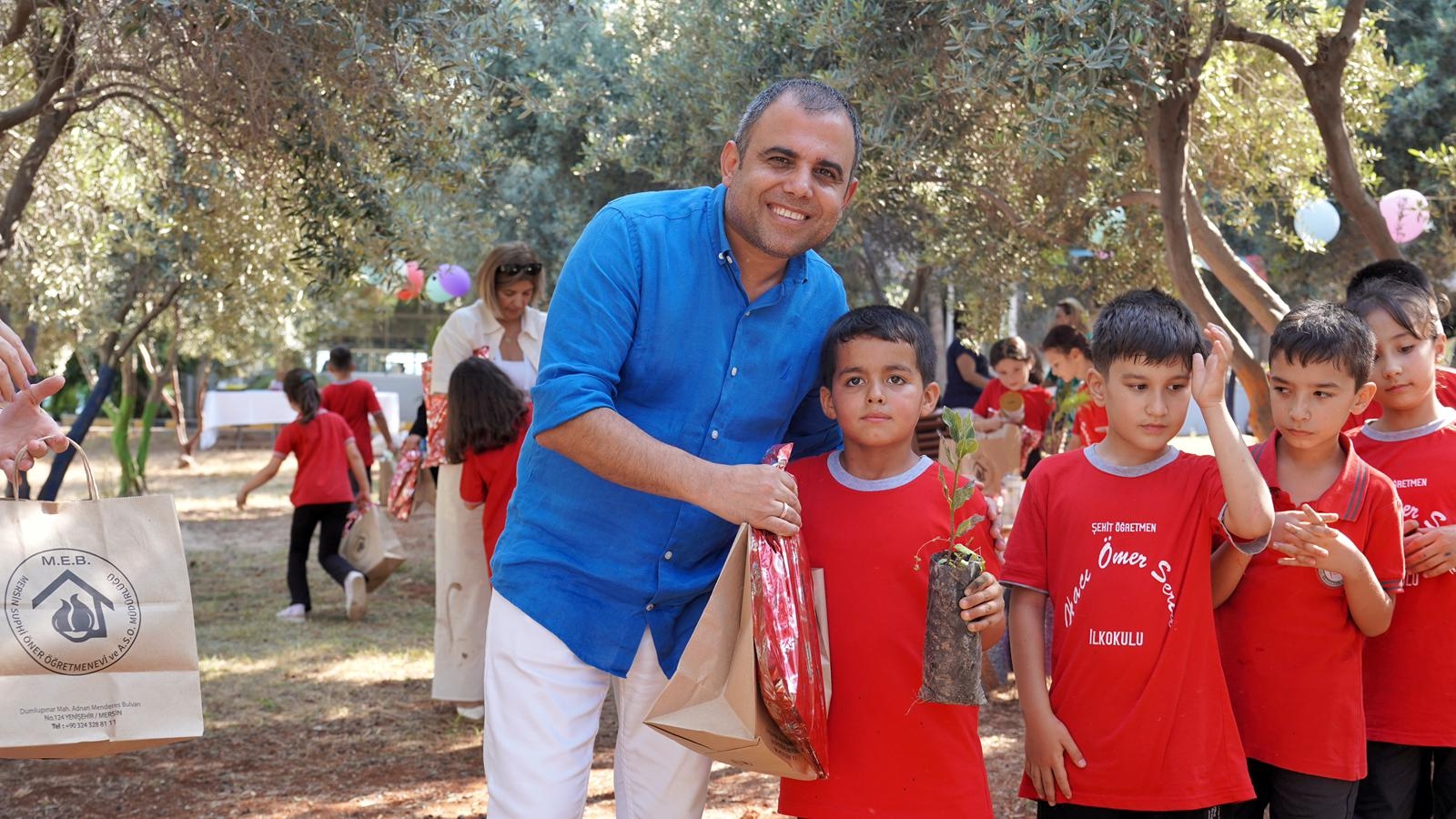 “İlk Ders Yeşil Vatan” teması çerçevesinde öğrencilere tohum ve çam fidanı verilirken, çocukların gözlerindeki heyecan ve mutluluk etkinliğe damga vurdu.