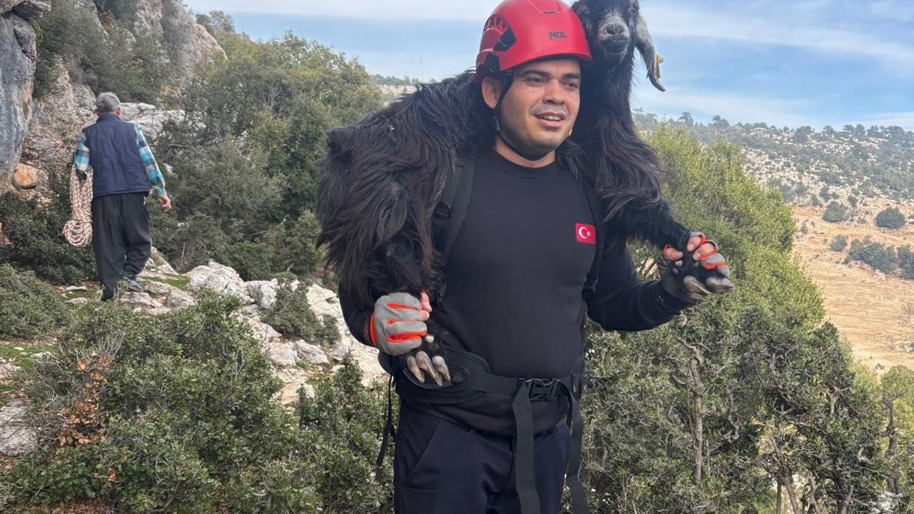 Mersin'de kayalıklarda mahsur kalan 2 keçi, itfaiye ekiplerinin kontrollü çalışmasıyla kurtarıldı.