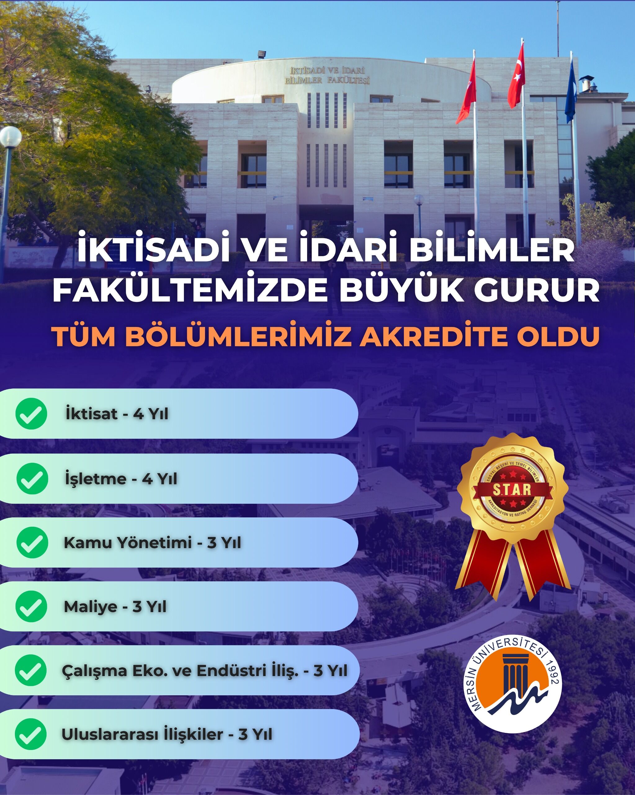 Mersin Üniversitesi İktisadi ve İdari Bilimler Fakültesi (İİBF), akademik kalite alanında önemli bir başarıya imza attı. Fakülte bünyesindeki tüm bölümler, STAR (Sosyal Beşeri ve Temel Bilimler Akreditasyon ve Rating Derneği) tarafından yürütülen değerlendirmeler sonucunda akreditasyon almaya hak kazandı.