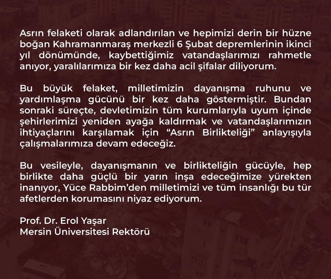 Mersin Üniversitesi Rektörü Prof.Dr.ERol Yaşar , Kahramanmaraş merkezli gerçekleşen ve 11 ilde asrın felaketi olarak derin izler bırakan depremin 2.yıl dönümünde yayımladığı mesajda , '' Asrın felaketinin yaralarının sarılmasında ve bundan sonra benzer acıların yaşanmaması için Asrın birlikteliği anlayışıyla çalışmalarımıza devam edeceğiz '' dedi.