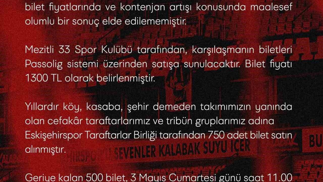 Bölgesel Amatör Lig’de (BAL) mücadele eden Eskişehirspor, bu hafta sonu Mezitli 33 Spor ile karşı karşıya gelecek. Mersin’de oynanacak ve şampiyonun belirleneceği karşılaşma için hazırlıklar sürerken, Eskişehirspor tarafından bir açıklama yayımlandı. Kulübün resmi sosyal medya hesabından yapılan açıklamada, "Sezonun son müsabakası olan Mezitli 33 Spor maçı ile ilgili, uzun süredir yürüttüğümüz girişim ve çabalar, rağmen bilet fiyatlarında ve kontenjan artışı konusunda maalesef olumlu bir sonuç elde edilememiştir. Mezitli 33 Spor Kulübü tarafından, karşılaşmanın biletleri satışa sunulacaktır. Bilet fiyatı bin 300 TL olarak belirlenmiştir" ifadeleri yer aldı.