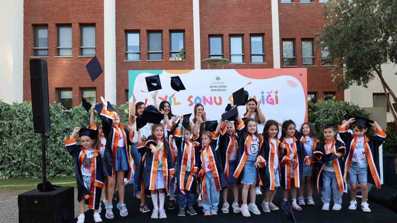 İzmir Ekonomi Üniversitesi bünyesinde 2022 yılında hizmet vermeye başlayan Beyaz Köşk Anaokulu’nun yıl sonu etkinliğinde, mezun olan çocukların yanı sıra anaokulunda eğitim gören diğer öğrenciler de yaptıkları etkinliklerle ailelerinin büyük beğenisini kazandı. ‘Çikolatalı Kurabiyeler, ‘Deniz Kabuğu’, ‘Marstaki Denizaltı’ ve Çılgın Kuklalar’ sınıfının öğrencileri, şarkılar söyleyip spor dersinde öğrendikleri hareketleri yaparak gönüllerince bir gün geçirdi. Minik Ekonomililer, derslerde yaptıkları resimlerden oluşan bir sergi de açtı. Tören sonunda diplomalarını alarak büyük bir heyecan ve coşkuyla keplerini atan çocuklar, renkli görüntüler oluşturdu.