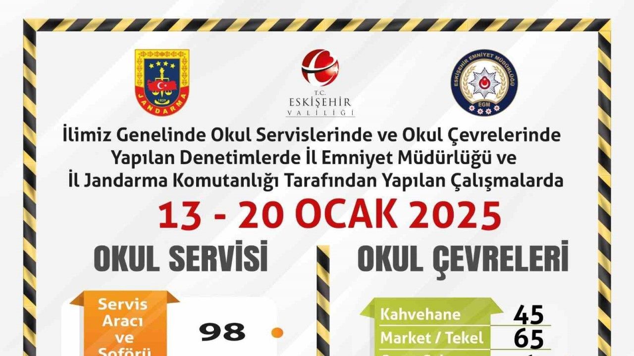 Edinilen bilgilere göre, Eskişehir İl Emniyet Müdürlüğü ve İl Jandarma Komutanlığı ekiplerince okul servislerinde ve çevrelerinde denetim yapıldı. İl genelinde 13-20 Ocak 2025 tarihleri arasında gerçekleştirilen çalışmalarda 81 servis aracı ve şoförü denetlenirken, 5 aracın kusurlu olduğu tespit edildi. Okul çevrelerinde ise 45 kahvehane, 65 market/tekel, 1 oyun salonu ve 88 park/bahçe kontrol edildi. Ayrıca 350 şahsa kimlik sorgusu yapıldığı öğrenildi.