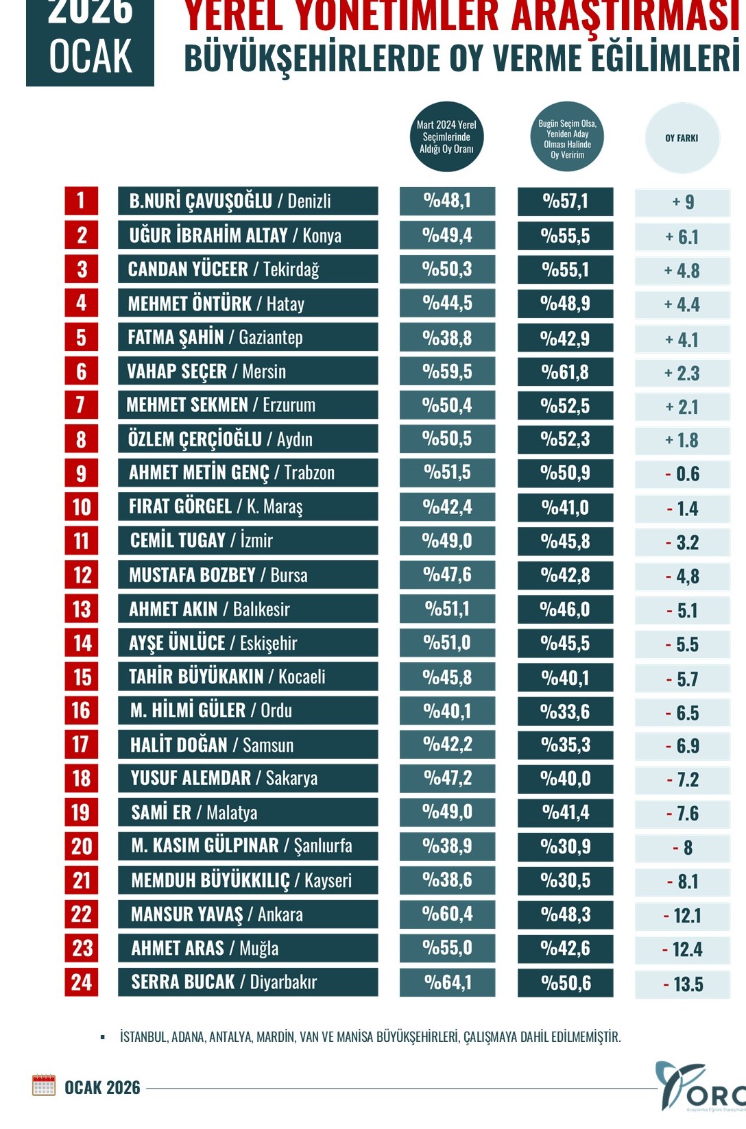 Araştırma, birçok büyükşehirde belediye başkanlarının oy oranlarında belirgin düşüşler yaşandığını gösterirken, Mersin’in bu genel eğilimin dışında kalması dikkat çekiyor. Ankara, İzmir, Bursa, Diyarbakır ve Muğla gibi büyükşehirlerde çift hanelere yaklaşan oy kayıpları görülürken, Mersin’de artış yaşanması, yerel yönetim performansının seçmen davranışı üzerindeki belirleyici rolünü güçlendiriyor.