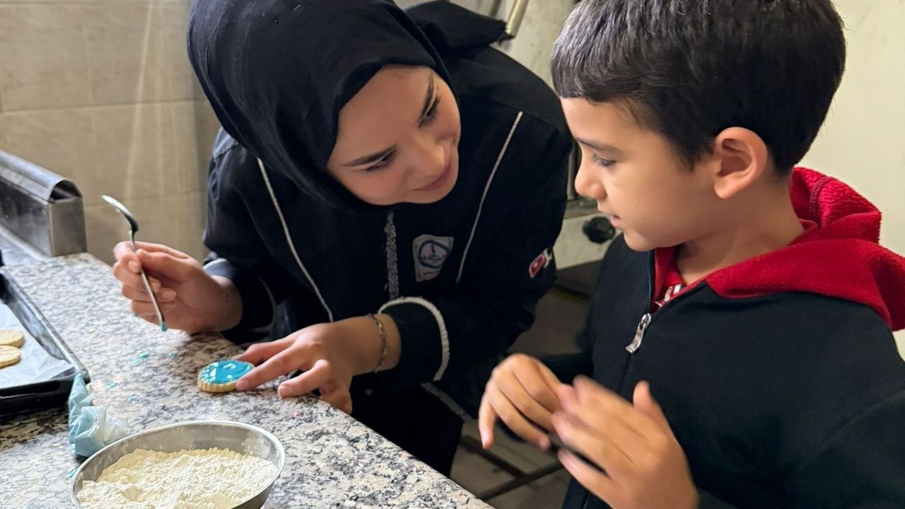 Manisa’nın Şehzadeler ilçesindeki Gazi İlkokulunda eğitim gören özel öğrenciler, İsmet İnönü Mesleki ve Teknik Anadolu Lisesi Yiyecek İçecek Bölümünde okuyan ablalarıyla okulun Yiyecek Atölyesinde hamur açıp kurabiye yaptı.