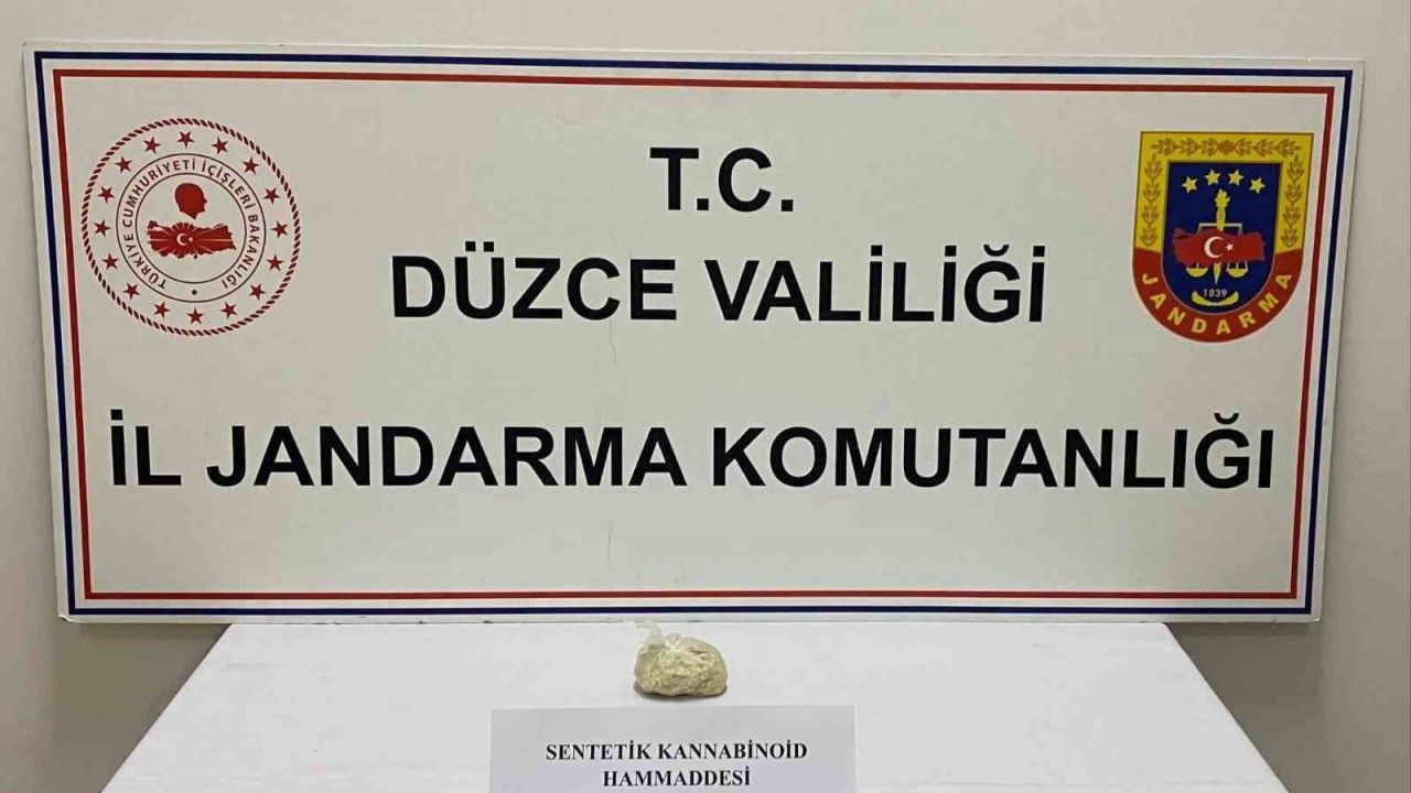 Düzce’de Jandarma ekiplerinin uyuşturucu ile mücadelesi sürüyor. Kaynaşlı ilçesi, Anadolu Otoyolu üzerinde Düzce Cumhuriyet Başsavcılığı koordinesinde Jandarma Narkotik Suçlarla Mücadele Şube Müdürlüğü ve uyuşturucu madde arama köpek unsuru ile birlikte yol kontrol faaliyetinde bulundu. Kontrol noktasında durdurulan araçta yolcu olarak bulunan U.K.K. (26) isimli şahsın yapılan kaba üst aramasında piyasa değeri yaklaşık 3 milyon TL olan uyuşturucu yapımında kullanılan 100 gram ağırlığında sentetik kannabinoid hammaddesi tespit edildi.