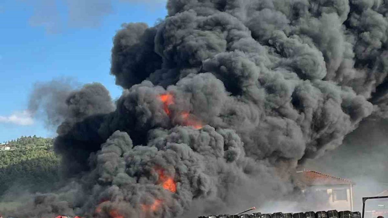 Bilecik’te bir soğuk hava deposu önündeki plastik kasalar tutuştu, gökyüzünü siyah duman kapladı.