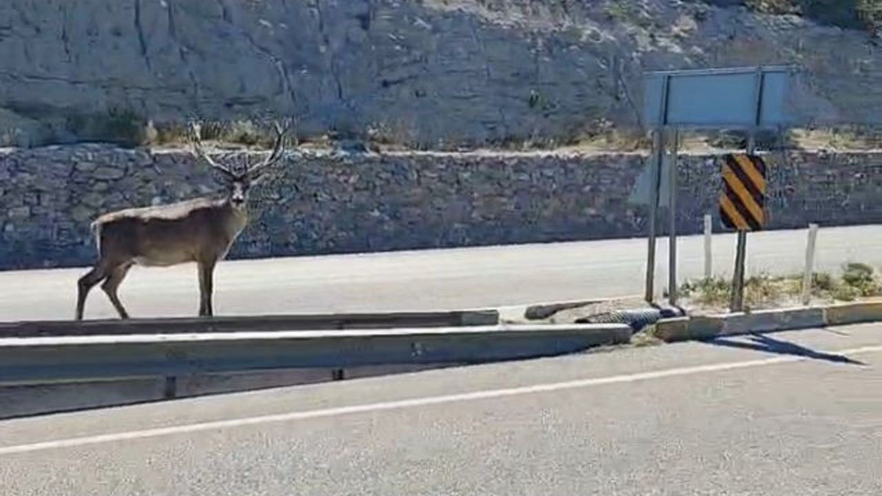 Afyonkarahisar-Ankara kara yolunda ilerleyen sürücüler refüjde koşan geyiği görünce hayrete düştü.