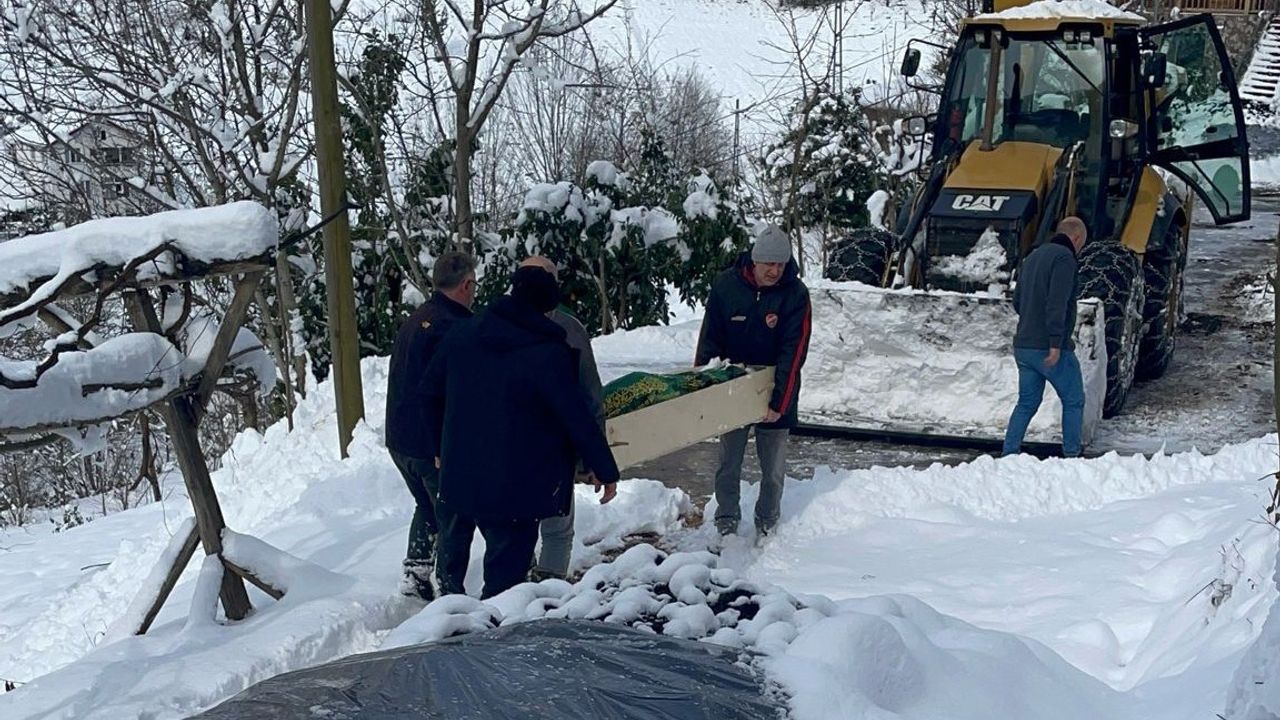 43 köy ve mahalle yolunun kar nedeniyle ulaşıma kapandığı Rize’de hayatını kaybeden 88 yaşındaki kadının tabutu iş makinesinin kepçesiyle taşınarak cenaze nakil aracına yerleştirildi.
