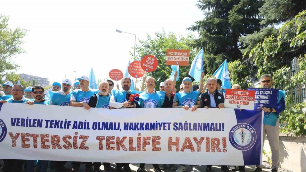 Burada konuşan Sağlık-Sen Genel Başkanı Mahmut Faruk Doğan, "Bugün 8. Dönem Toplu Sözleşme görüşmelerinde kamu işvereninin sunduğu teklife karşı ortak irademizi sesimizi ve kararlılığımızı göstermek için buradayız. Sorunların masada çözülme imkanı varken kamu işvereninin yetersiz ve adaletsiz teklifi kamu görevlilerini ve emeklileri meydanlara ve eylemlere mecbur kılmıştır. Bildiğiniz üzere kamu işvereni 2026 için yüzde 10+6 altı 2027 için 4+4 zam önerisinde bulunmuştur. Bu teklif memurun emeğini alın terini yok sayan yetersiz bir tekliftir. Bu teklif kabul edilebilirlikten çok uzaktır" açıklamasında bulundu.