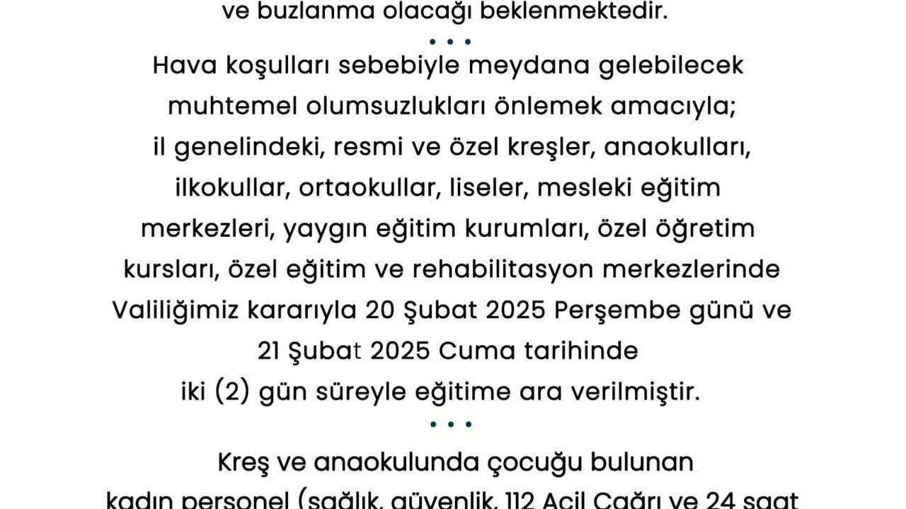 Sakarya’da yarın ve Cuma günü etkili olması beklenen yoğun kar yağışı sebebiyle şehir genelinde resmi ve özel okullarda eğitime iki gün ara verildi. Konuya ilişkin Sakarya Valiliği’nden yapılan yazılı açıklamada, "Meteoroloji Genel Müdürlüğü’nden alınan verilere göre 20 Şubat Perşembe ve 21 Şubat Cuma günü Sakarya’da yoğun kar yağışı ve buzlanma olacağı beklenmektedir. Hava koşulları sebebiyle meydana gelebilecek muhtemel olumsuzlukları önlemek amacıyla; il genelindeki, resmi ve özel kreşler, anaokulları, ilkokullar, ortaokullar, liseler, mesleki eğitim merkezleri, yaygın eğitim kurumları, özel öğretim kursları, özel eğitim ve rehabilitasyon merkezlerinde Valiliğimiz kararıyla 20 Şubat 2025 Perşembe günü ve 21 Şubat 2025 Cuma tarihinde 2 gün süreyle eğitime ara verilmiştir. Kreş ve anaokulunda çocuğu bulunan kadın personel (sağlık, güvenlik, 112 Acil Çağrı ve 24 saat esasına göre hizmet veren birimlerde çalışan personelin durumu hizmetin gereği olarak ilgili birim amirleri tarafından değerlendirilecektir.) Malul, engelli ve hamile kamu çalışanları idari izinli sayılacaktır" denildi.