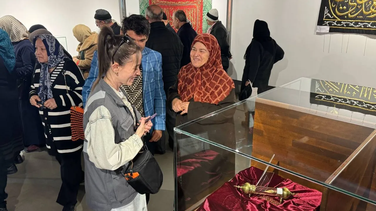 Ofis Sanat Merkezi’nde sergilenen mukaddes eserleri hayatlarında ilk kez görme fırsatı bulan yaşlılar sakal-ı şerif, saç-ı şerif, Kâbe örtüsü ve daha birçok kıymetli eseri incelerken duygu dolu anlar yaşadı.