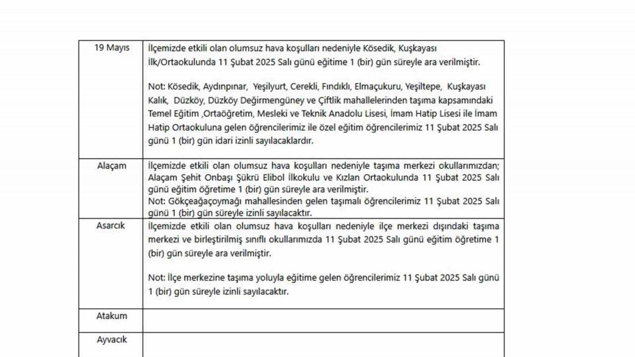 İl Milli Eğitim Müdürlüğü, olumsuz hava şartları nedeniyle 11 Şubat Salı günü 19 Mayıs, Alaçam, Asarcık, Çarşamba, Ladik ve Salıpazarı ilçelerinde bazı okullarda eğitim-öğretime 1 gün süreyle ara verildiğini açıkladı. 19 Mayıs ilçesinde Kösedik Kuşkayası İlk ve Ortaokulunda eğitime 1 gün süreyle ara verildiği; Kösedik, Aydınpınar, Yeşilyurt, Cerekli, Fındıklı, Elmaçukuru, Yeşiltepe, Kuşkayası Kalık, Düzköy, Düzköy Değirmengüney ve Çiftlik mahallelerinden taşıma kapsamındaki temel eğitim, ortaöğretim, Mesleki ve Teknik Anadolu Lisesi, İmam Hatip Lisesi ile İmam Hatip Ortaokulu’na gelen öğrenciler ve özel eğitim öğrencilerinin ise 1 gün idari izinli sayılacağı belirtildi.