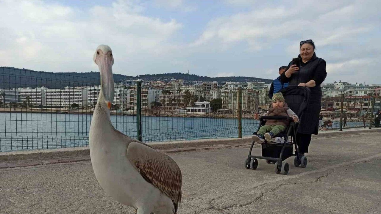 Mersin’in Silifke ilçesi Taşucu iskelesinde bir pelikan, vatandaşların şaşkın bakışları arasında özgürce dolaşarak bölge halkının maskotu haline geldi.