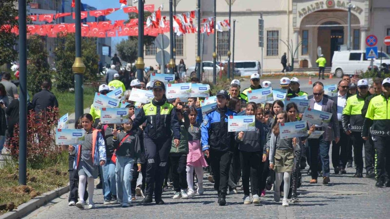 Sinop’ta Karayolu Trafik Haftası kapsamında trafik güvenliğine yönelik farkındalık oluşturmak amacıyla, ilkokul öğrencileri tarafından yürüyüş düzenlendi. Hükümet Meydanı’ndan Uğur Mumcu Meydanı’na protokol üyeleriyle birlikte yürüyen öğrencilere uygulamalı trafik eğitimi verildi.