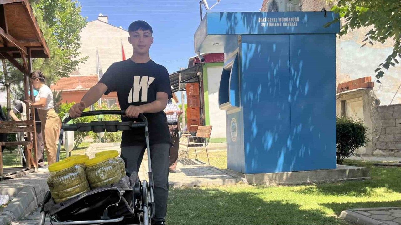 Eskişehir sokaklarında bebek arabasına yüklediği salamura üzüm bağı yaprakları ile dolu bidonları taşıyan 16 yaşındaki Kutsal Yıldızlar, harçlığını çıkarıyor. Üç kilo yaprağın bulunduğu bidonları 350 TL’ye satan küçük çocuk sıcağa rağmen, sokaklarda satış yapmaya devam ediyor. Tek bir mahallede değil kentin birçok noktasını dolaşarak satış yapan Yıldızlar’ın azmi dikkat çekiyor.