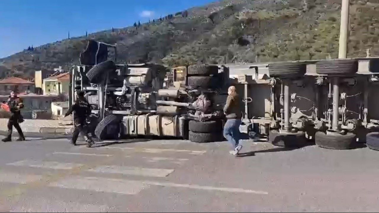 Söke-Milas karayolu üzerindeki Yenidoğan Kavşağı’nda kömür yüklü tır devrildi.