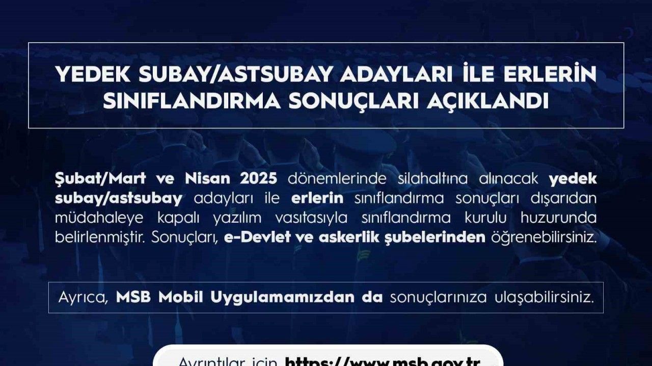 Milli Savunma Bakanlığından yapılan açıklamada, "Şubat/Mart ve Nisan 2025 dönemlerinde silahaltına alınacak yedek subay/astsubay adayları ile erlerin sınıflandırma sonuçları dışarıdan müdahaleye kapalı yazılım vasıtasıyla sınıflandırma kurulu huzurunda belirlenmiştir. Sonuçları; e-Devlet kapısından, askerlik şubelerinden ve MSB Mobil uygulamasından öğrenebilirsiniz" denildi.