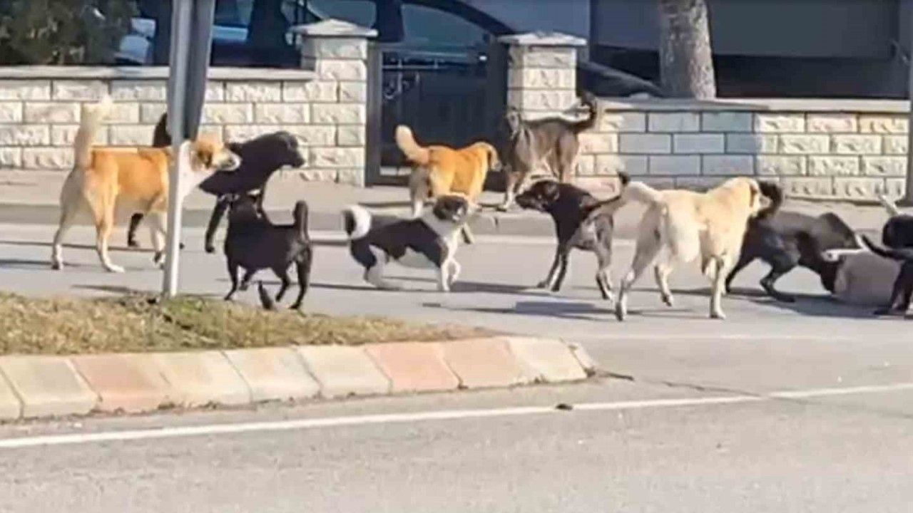 Edirne’de sürü halinde hareket eden 15’ten fazla köpek başka bir köpeğe saldırdı. Vatandaşlar tarafından korku dolu gözlerle izlenen o anlar, saniye saniye kaydedildi. Yoldan geçen sürücülerin araçlarının kornalarına basmalarına rağmen birbirlerine saldırmaya devam eden köpeklerin kavgasını motokurye ayırdı. Motokuryenin motosikletiyle köpeklerin arasına girmesiyle köpekler caddeden kaçmaya başladı. Bölgede esnaflık yapan Recep Genç ve Ahmet Elemenli, sürü halinde hareket eden köpeklerin zaman zaman saldırgan hareketler sergilediğini söyledi.