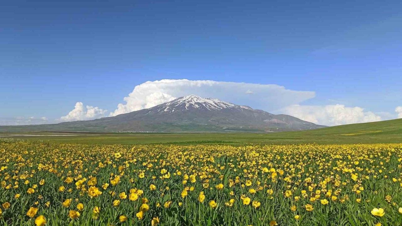 Süphan Dağı’nın eteklerinde, 2 bin 150 metre rakımda bulunan yayla, sarı düğün çiçeklerinin açmasıyla rengarenk bir görünüme kavuştu. Zirvesinde yılın dört mevsimi kar eksik olmayan heybetli Süphan Dağı ile birleşen manzara, doğa tutkunlarını ve fotoğrafçıları bölgeye çekiyor.