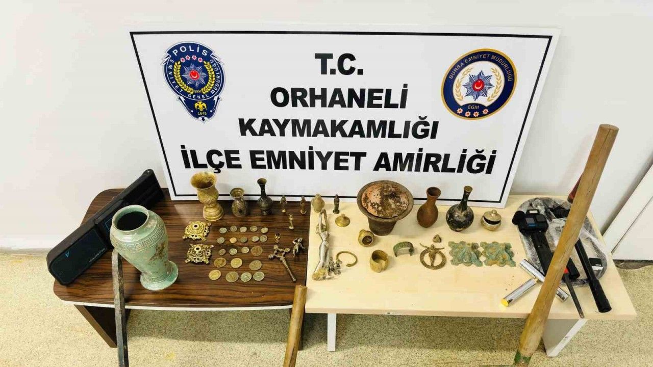 Bursa’nın Orhaneli ilçesinde kaçak kazı yapan 3 şüpheli polis ekiplerinin düzenlediği baskında yakalandı. Yapılan aramada sikke, heykel ve çok sayıda tarihi eser ele geçirildi.
