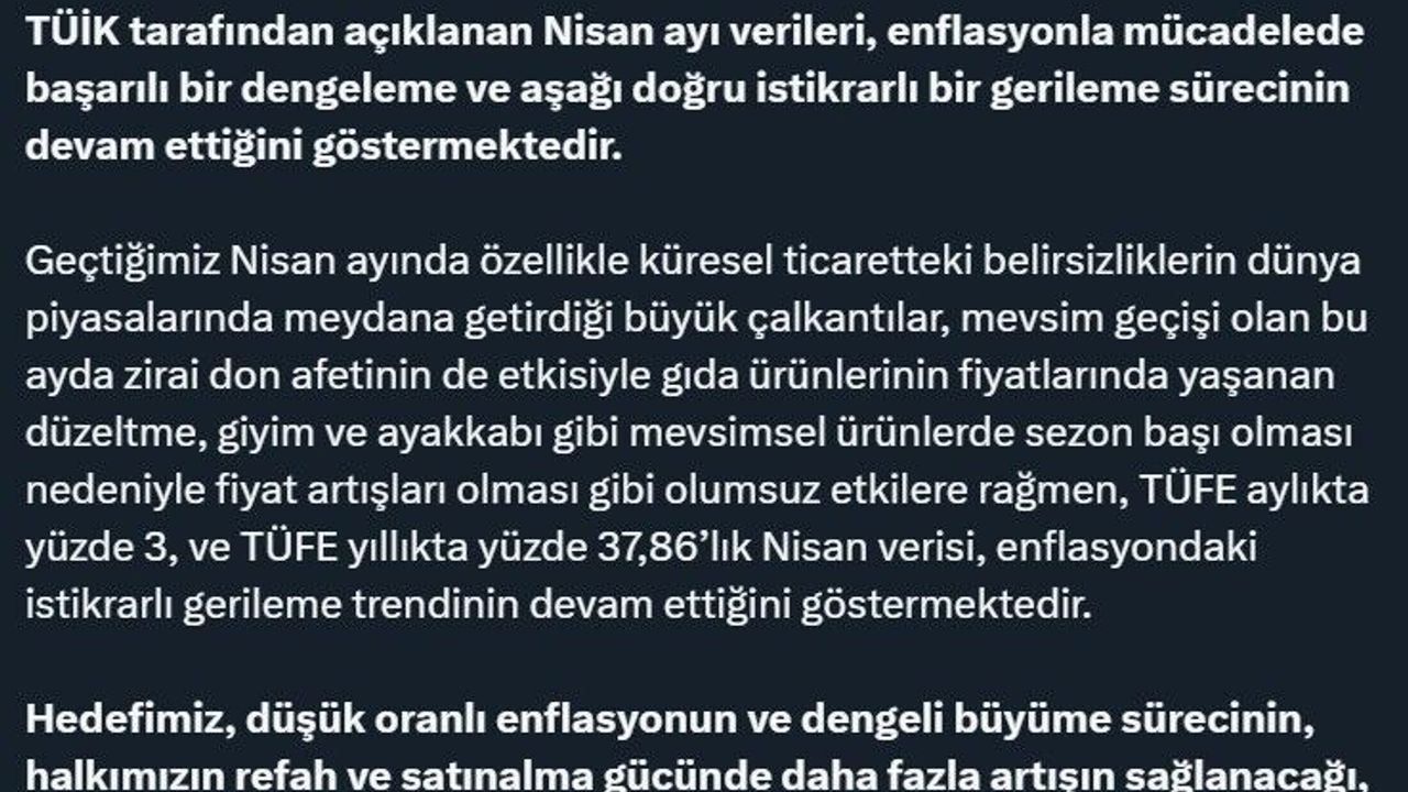 "TÜİK tarafından açıklanan Nisan ayı verileri, enflasyonla mücadelede başarılı bir dengeleme ve aşağı doğru istikrarlı bir gerileme sürecinin devam ettiğini göstermektedir. Geçtiğimiz Nisan ayında özellikle küresel ticaretteki belirsizliklerin dünya piyasalarında meydana getirdiği büyük çalkantılar, mevsim geçişi olan bu ayda zirai don afetinin de etkisiyle gıda ürünlerinin fiyatlarında yaşanan düzeltme, giyim ve ayakkabı gibi mevsimsel ürünlerde sezon başı olması nedeniyle fiyat artışları olması gibi olumsuz etkilere rağmen, TÜFE aylıkta yüzde 3, TÜFE yıllıkta yüzde 37,86’lık Nisan verisi, enflasyondaki istikrarlı gerileme trendinin devam ettiğini göstermektedir. Hedefimiz, düşük oranlı enflasyonun ve dengeli büyüme sürecinin, halkımızın refah ve satınalma gücünde daha fazla artışın sağlanacağı, yurt içi ve uluslararası alanda güçlü ve dirençli bir ülkemiz ekonomisini sürdürülebilir kılmaktır."