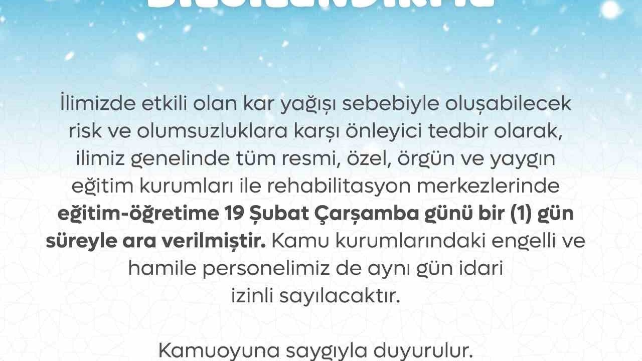 Tokat Valiliği tarafından yapılan açıklamada, 19 Şubat Çarşamba günü tüm resmi, özel, örgün ve yaygın eğitim kurumları ile rehabilitasyon merkezlerinde eğitime ara verileceği duyuruldu. Ayrıca kamu kurumlarında görevli engelli ve hamile personelin de idari izinli sayılacağı belirtildi. Yetkililer, vatandaşları olumsuz hava şartları nedeniyle yaşanabilecek muhtemel risk ve olumsuzluklara karşı dikkatli olmaları konusunda uyardı.