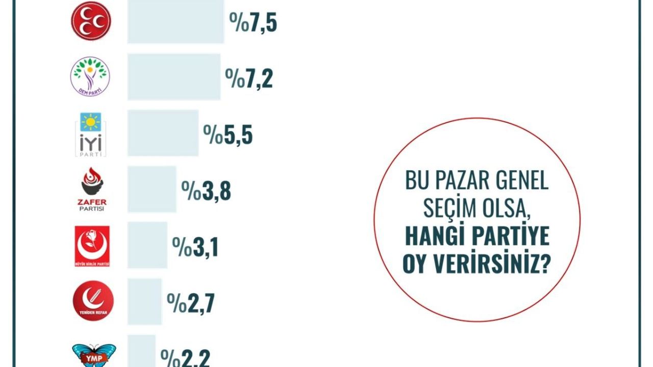 Ankette MHP yüzde 7,5, DEM Parti yüzde 7,2 oy oranına ulaşarak orta sıralarda yer aldı. İYİ Parti yüzde 5,5 ile dikkat çekerken, Zafer Partisi yüzde 3,8, Büyük Birlik Partisi yüzde 3,1 oy aldı.