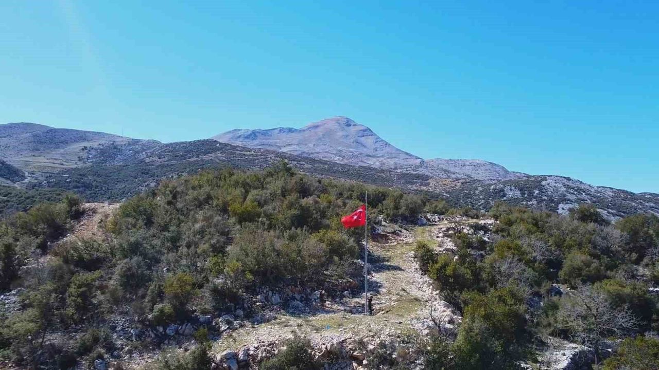 HATAY (İHA) - Türkiye'nin en güneyinde yer alan Suriye sınırındaki Hatay'ın Yayladağı ilçesi Bezge Mahallesi'nde 7 ayrı tepeye 7 Türk bayrağı dikildi.