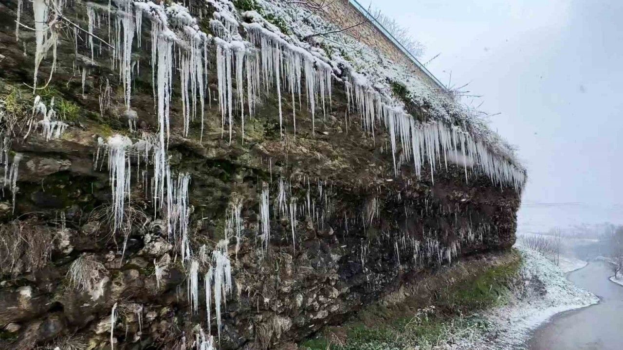 Hava sıcaklıklarının sıfırın altında 7 dereceye düştüğü Karabük’ün Safranbolu ilçesinde yamaç ve kayalıklarda sarkıtlar oluştu.