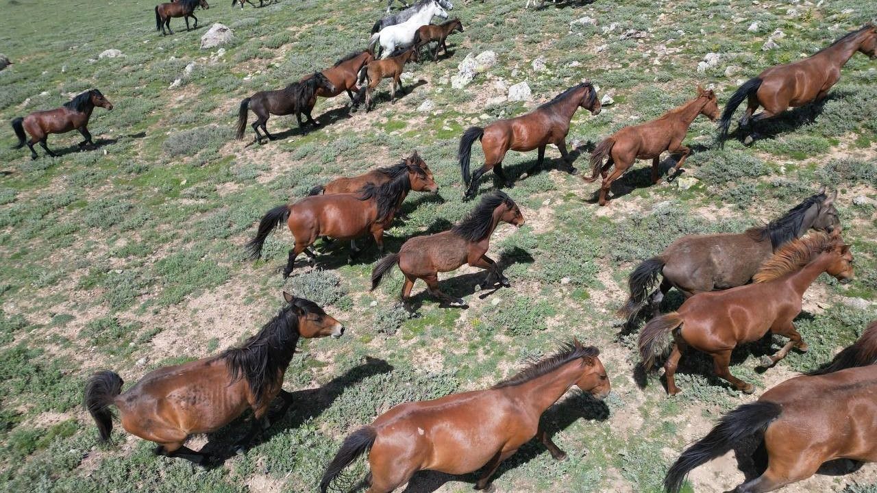 Sevimlilikleri ve ürkeklikleri ile bilinen yılkı atları yaz mevsimin gelmesi ile yaylardan aşağı inmeye başlarken, atların sürülerin halinde gezdiği anlar ise dron kameralarına yansıdı.